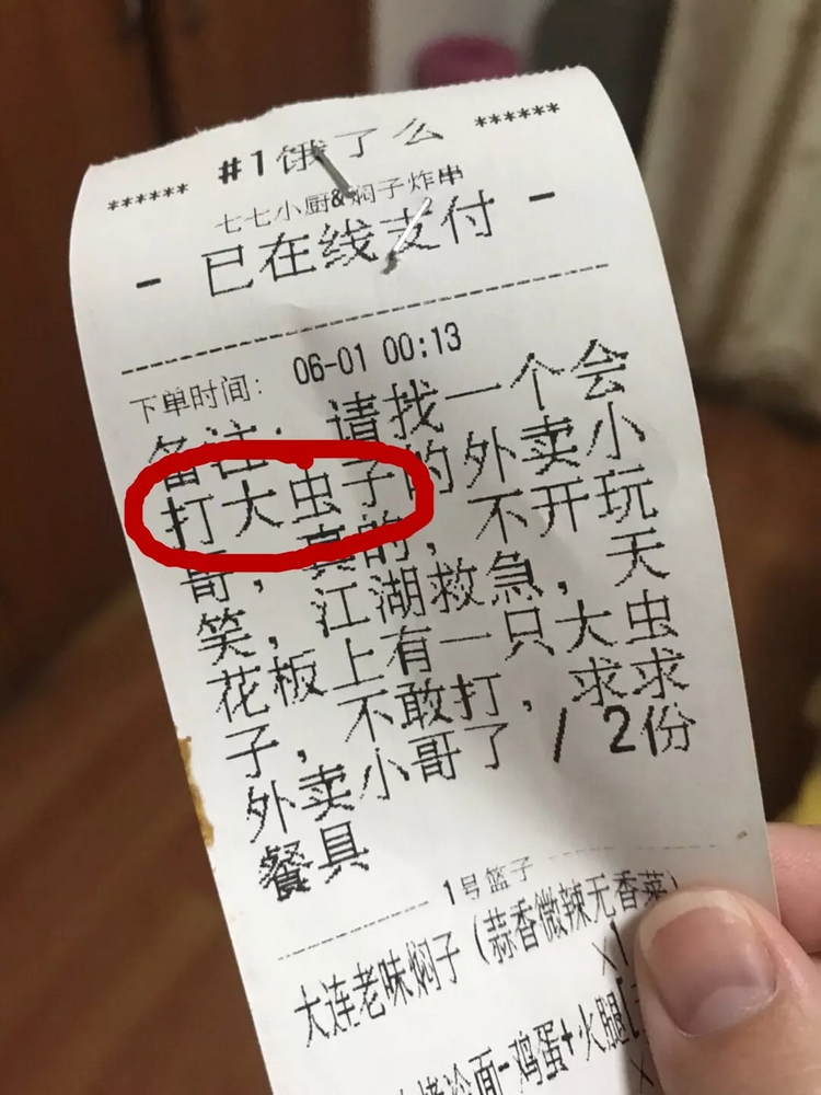 请找一个会打大虫子的外卖小哥,真的,不开玩笑,江湖救急,天花板上有一只大虫子,不敢打,求求外卖小哥了……