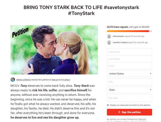 在《复仇者联盟4:终局之战》中,钢铁侠为了打响指而牺牲了自己,让一众影迷大喊难过。一个多月前,有钢铁侠迷发起请愿活动,希望漫威能够复活钢铁侠,截至目前已经获得了3万多影迷的支持。请愿里写道: