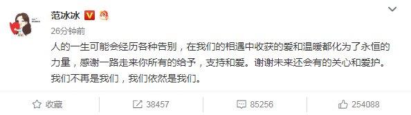 然而,2019年6月27日,范冰冰微博宣布与李晨分手。范冰冰感慨称:“人的一生可能会经历各种告别,在硬汉视频在线观看手机版的相遇中收获的爱和温暖都化为了永恒的力量,感谢一路走来你所有的给予,支持和爱。谢谢未来还会有的关心和爱护。”而在范冰冰微博最后一句“硬汉视频在线观看手机版不再是硬汉视频在线观看手机版,硬汉视频在线观看手机版依然是硬汉视频在线观看手机版。”则直接与官宣恋情时的“硬汉视频在线观看手机版”相呼应。之后李晨转发称“从朋友到爱人,再做回朋友,情感的形式会变,但你我之间最纯粹的感觉不会变”,正面对分手传闻进行证实。(LXY/文)